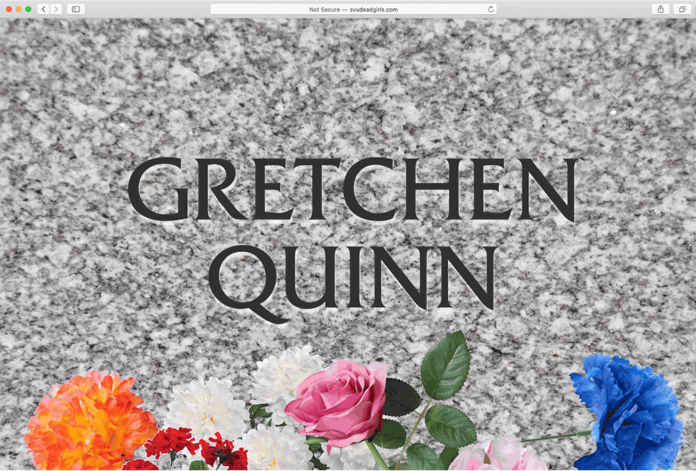 The website’s landing page is a gravestone engraved with one of their names at a time. The user must click on the name to advance through all 148 of the murdered women and girls. The SVU opening credits “dun dun” plays with each click. This sound is humorous at first, but quickly becomes grating.